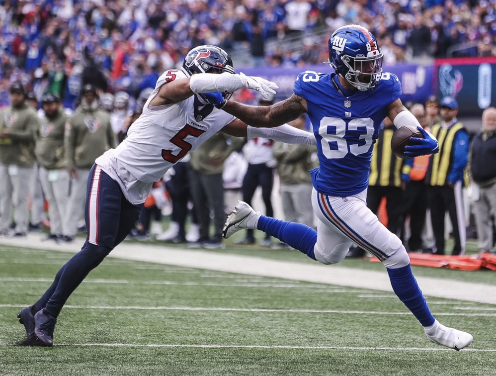 Dane Belton, playing in injured Xavier McKinney’s spot, intercepted Texans QB Davis Mills in the end zone in the fourth quarter with Houston looking to pull within one score.
