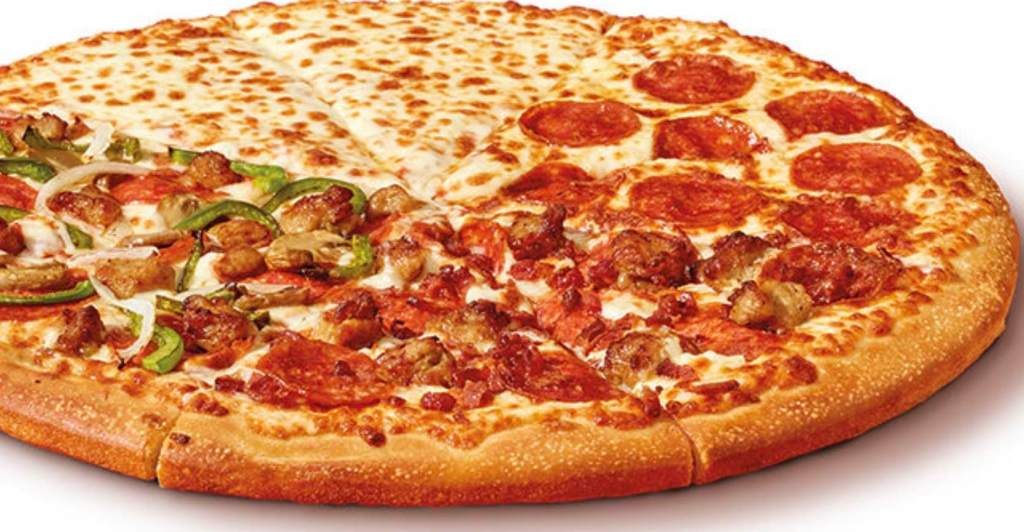 The Four-N-One Pizza features a large pizza divided into four sections with two slices each of: