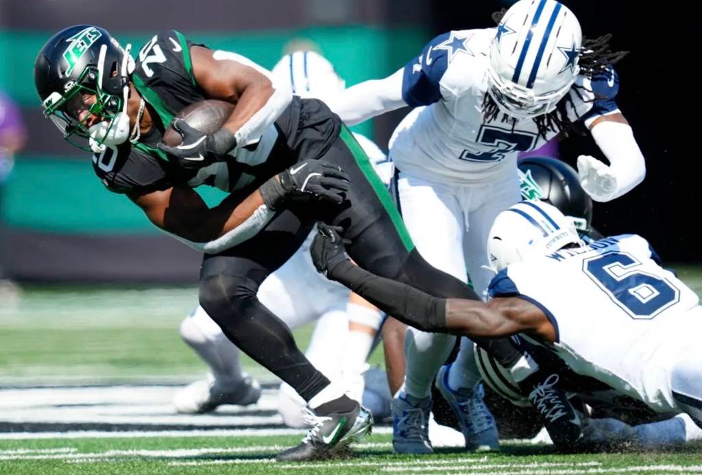 Justin Fields threw for 283 yards and two touchdowns while running for 26, and Breece Hall rushed for 113. Dak Prescott threw four touchdown passes to continue his MVP-like pace, and the Cowboys ran for 180 yards.